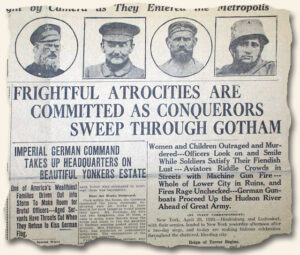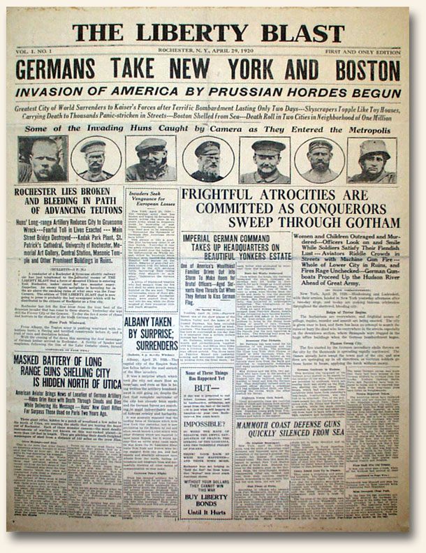 While the two photos above show The Liberty Blast with a dateline of April 29, 1920, this newspaper with “fictious reporting” was actually printed on April 20, 1918 “in the hope that in some small way it may serve to awaken in the hearts & minds of those who read it a realization of those horrors of a great world war, so far from and yet to near to American shores, American life, and American people…”.