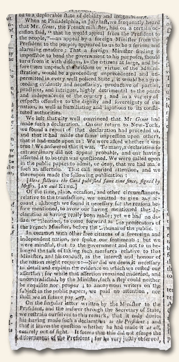 Citizen who? While exploring newspapers from the 18th and early 19th centuries over the past few decades, I noticed the name “Citizen Genet” appearing more than once—always tied to some sort of “affair.” As a novice historian at the time (my academic background is actually in mathematics and engineering), and given my aversion to sensationalized “yellow journalism,” I let it pass. With tens of thousands of fascinating topics to explore through our beloved collectible, I never stopped to uncover who he really was or what his “affair” involved.