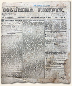 “The Columbia Phoenix arose out of the charred remains of Columbia, the capital city of South Carolina, in the aftermath of the Civil War to record its losses and bear witness to its gradual recovery. A triweekly newspaper, the Phoenix first appeared on Tuesday, March 21, 1865, mere weeks after fires had razed a third of the city. It struck a defiant tone, declaring, “Our city shall spring, from her ashes, and our Phoenix, we hope and trust, shall announce the glorious rising! God save the state!”