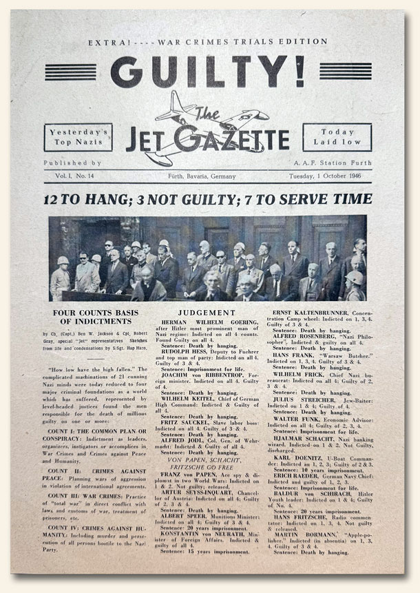 But as luck would have it, a Nuremberg suburb–Furth–had a former Nazi air base, captured by American forces in early April, 1945 & converted to a U.S. air base. And better yet, it produced a small, obviously low-circulation newspaper called “The Jet Gazette”. The October 1, 1946 issue was devoted to the results of the trials. And being an American air base, it’s in English. It was a great find that I suspected never existed!
