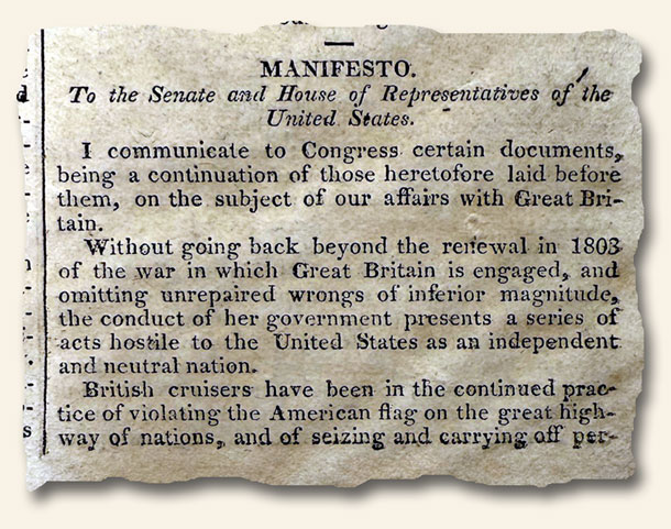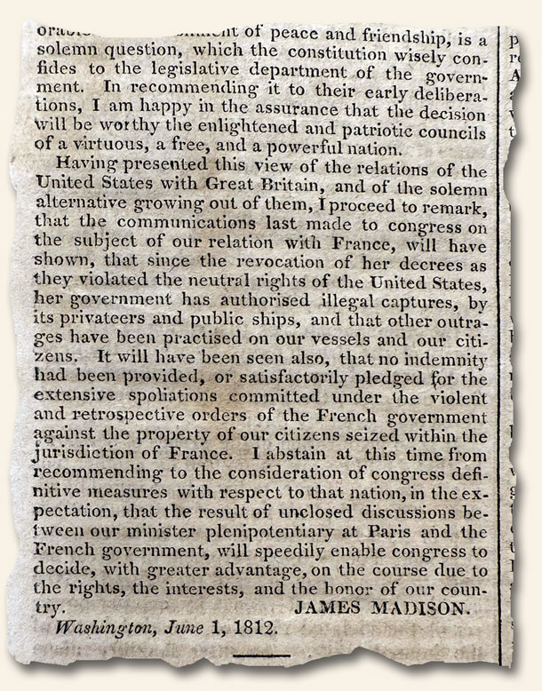 It wasn’t always this way. Take the War of 1812: President James Madison believed the U.S. needed to go to war with Great Britain. Did he send troops under a euphemism like “military operation”? No. He went straight to Congress with a detailed manifesto explaining why war was necessary. That document, printed in The War on June 27, 1812, shows just how seriously Madison took the Constitution’s war powers. The introduction and conclusion of his lengthy plea are shown below.