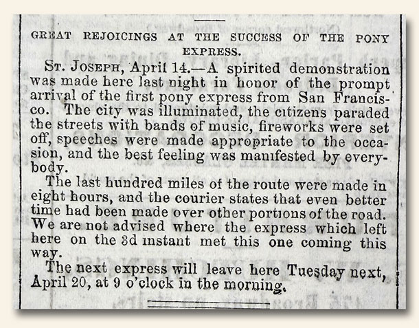 That’s exactly what happened to me recently while examining the April 16, 1860 issue of The Evening Post (New York). My original goal was to locate coverage of the completion of the first run of the Pony Express, and to my delight, I found not one but two front-page reports. Front-page coverage of such events is rare enough—but two related pieces? A true collector’s treat.