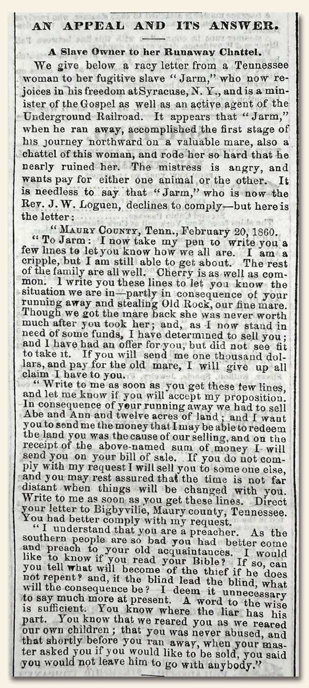 As I continued browsing for additional Pony Express material within the issue, I stumbled upon one of those unforgettable “hidden gems”: a printed exchange between a runaway slave and his former master. While not an account of a major historical event, few subjects evoke as much emotion as slavery, and reading such raw, personal correspondence in a period newspaper was deeply moving.