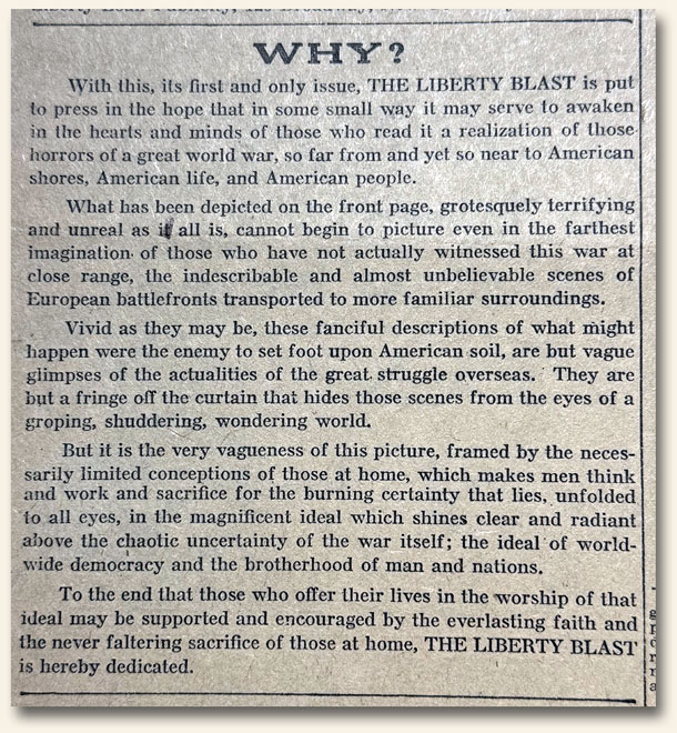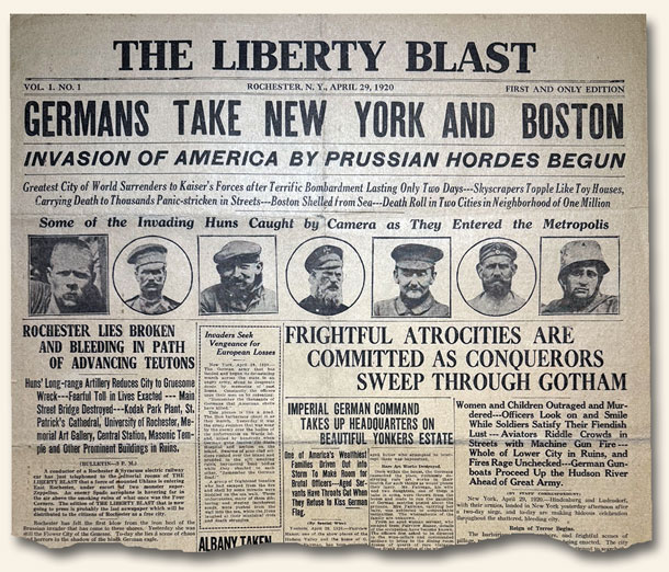 We recently came upon a “what if” newspaper. Although we’ve had a few, including use of the atomic bomb on American cities, or end-of-the-world scenarios, this issue of “The Liberty Blast” (shown below) is printed as if Germany had won World War I. Although the dateline reads “April 29, 1920”, the editorial on page 2 notes that it was published on April 29, 1918, before World War I had come to an end.