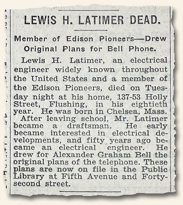 Lewis who? A collecting-friend recently asked us if we had the death report of Lewis H. Latimer. He sends us similar requests quite frequently, but it rare that I have never heard of the person who’s obit he is seeking. Lewis Latimer is one of the exceptions, and the time spent bringing myself up to speed was worth the effort. Such explorations are one of the attributes of collecting historic newspapers so fascinating. Shown below, absent of any editorializing, is what was found in The New York Times for December 13, 1928, followed by a bit of background. I hope you enjoy.